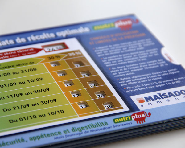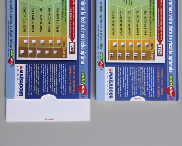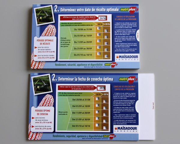 Impresión de tablas con datos relativos a la cosecha de maíz. Desplazando la ficha interior nos indica el período óptimo de recogida según variables, a través del troquelado. En diferentes idiomas.